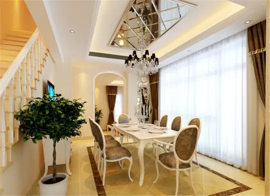 餐厅有大大的落地窗,使整个餐厅显得宽敞明亮,在加上顶面茶镜的运用,温馨浪漫的氛围油然而生。