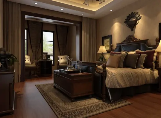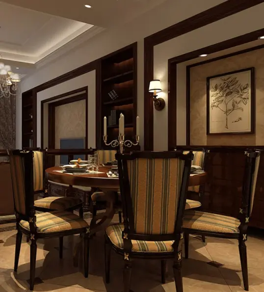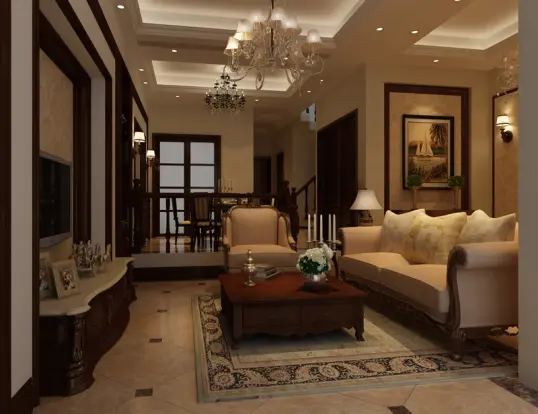 本案的整体格调欧式带点复古的感觉、雅致休闲、色调沉稳,凸显了业主高贵优雅的生活品味。直线条吊顶,错落有致,不同的色彩区分使用空间更具有层次感。欧美风所固有的自然、经典还有斑驳老旧的印记在客厅美式家具中得以体现,似乎能让时光倒流,让生活慢下来。