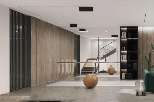 地下活动室,此处为小主人的活动区域,跳舞健身的活动范围,为了让空间视线连贯选用了落地镜面,通过空间的镜像空间无线延伸...