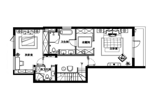 二楼为全家的睡眠休憩区,儿卧原户型分割琐碎局促,设计把墙体拆除增加学习收纳融为一个大的空间,从空间上划分区域,让整体更开阔大气