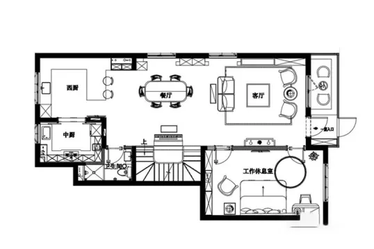 一层空间为动区,日间活动休憩、就餐、读书弹琴均在此空间,客厅连接地面花园,开门即可通往户外,外面为公共区域不允许做门廊玄关,室内空间亦不宜做内玄关,因此在通道尽头做了远玄关