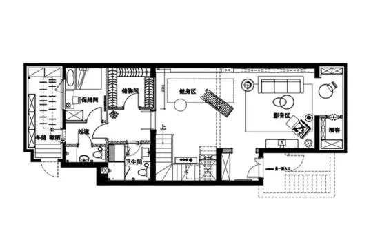 地下室为全家的活动区,及生活区,预留了保姆的休憩、工作的区域,一门为界,右侧区域为主人活动区、可健身跳舞、看片、小酌...
