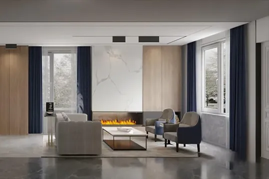 此空间为客厅区域,整体墙面贯穿木墙板,主墙放置了壁炉,岩板与木质材质的强烈对比更凸显了现代简约的极致气息;右侧是封闭的书柜,满足女主人喜欢点线面的整齐整洁感,并满足收纳的诉求。