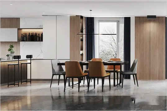 此空间为餐厅区域,贯穿整体墙面木墙板与地面大量的石材一直延伸进了厨房,与厨房白色材质完美的结合在一起,在丰富视觉空间的同时强化了简约的主旨