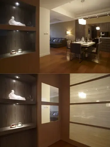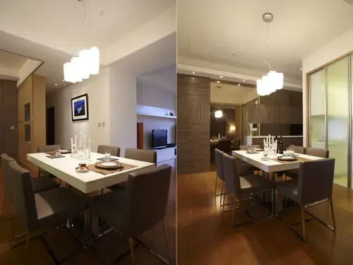 现代简约风格在处理空间方面一般强调室内空间宽敞、内外通透,在空间平面设计中追求不受承重墙限制的自由。墙面、地面、顶棚以及家具陈设乃至灯具器皿等均以简洁的造型、纯洁的质地、精细的工艺为其特征。并且尽可能不用装饰和取消多余的东西,认为任何复杂的设计,没有实用价值的特殊部件及任何装饰都会增加建筑造价,强调形式应更多地服务于功能。