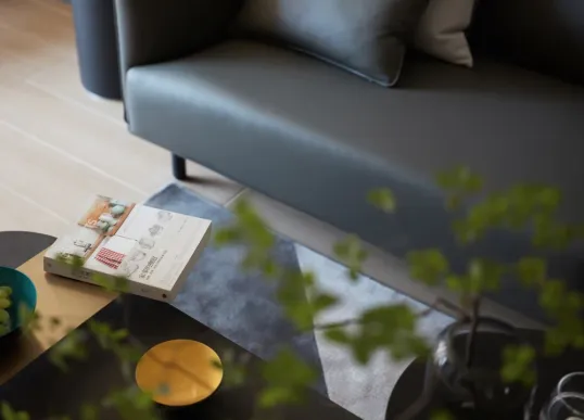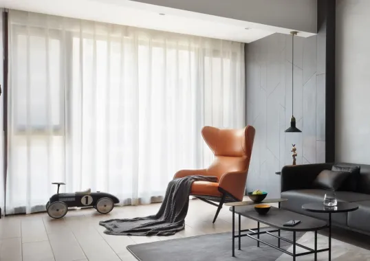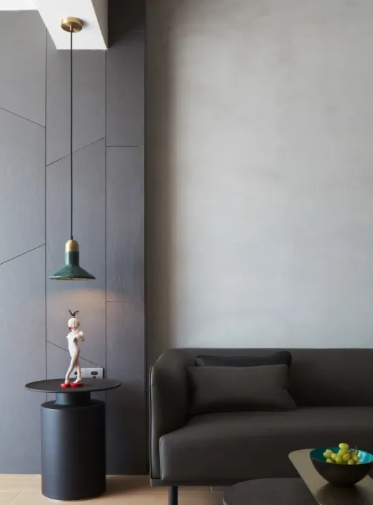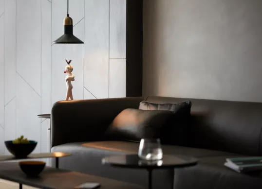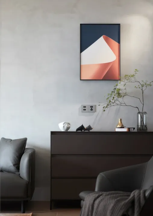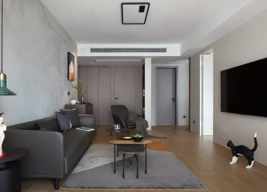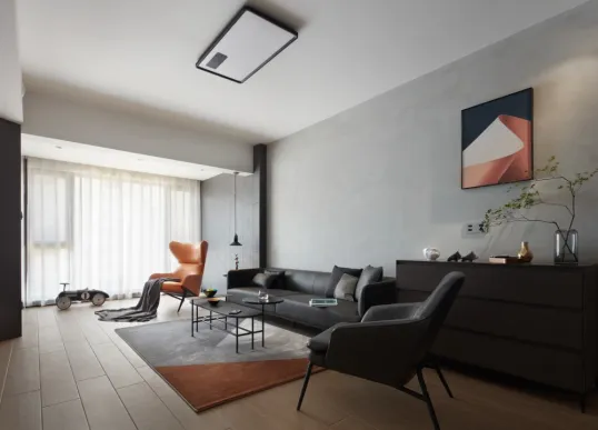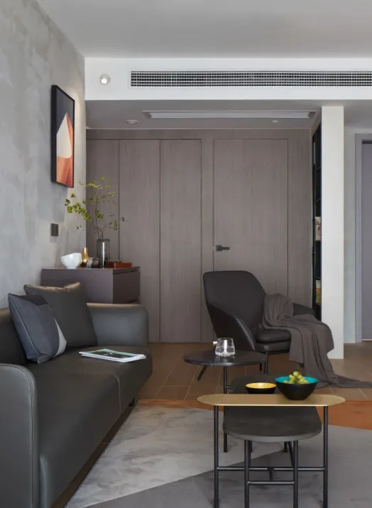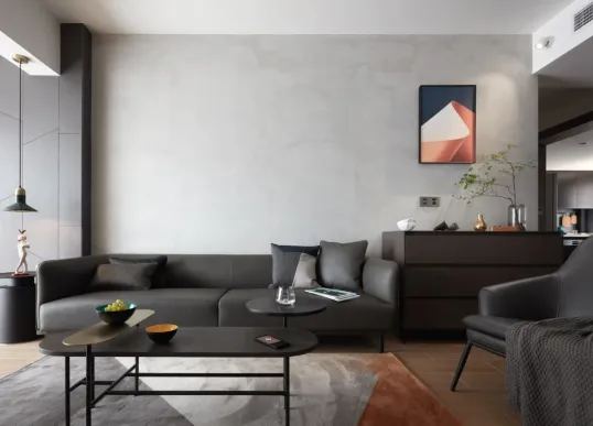 沙发的选择颇费周章,最终选择真皮沙发,能有效映衬灰色的高级感