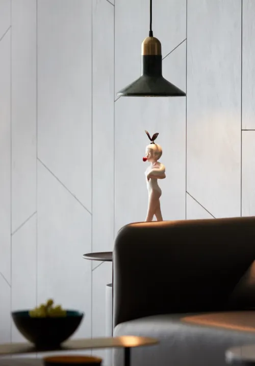 低垂的吊灯,映照在趣味盎然的饰品上,是一道靓丽的风景,也是一抹温馨