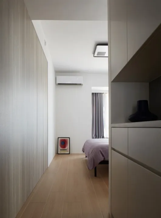 次卧进门处收纳柜有足够的收纳空间,对面采用木纹色墙饰